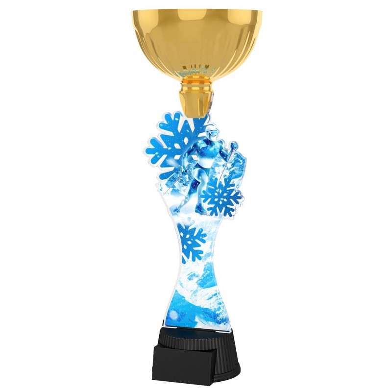 Akrylátová trofej. V ceně trofeje není zahrnuta cena štítku. Akrylátový motiv 0.6 cm. Zlatý kalich. Výšky trofejí jsou orientační. Oboustranný tisk.