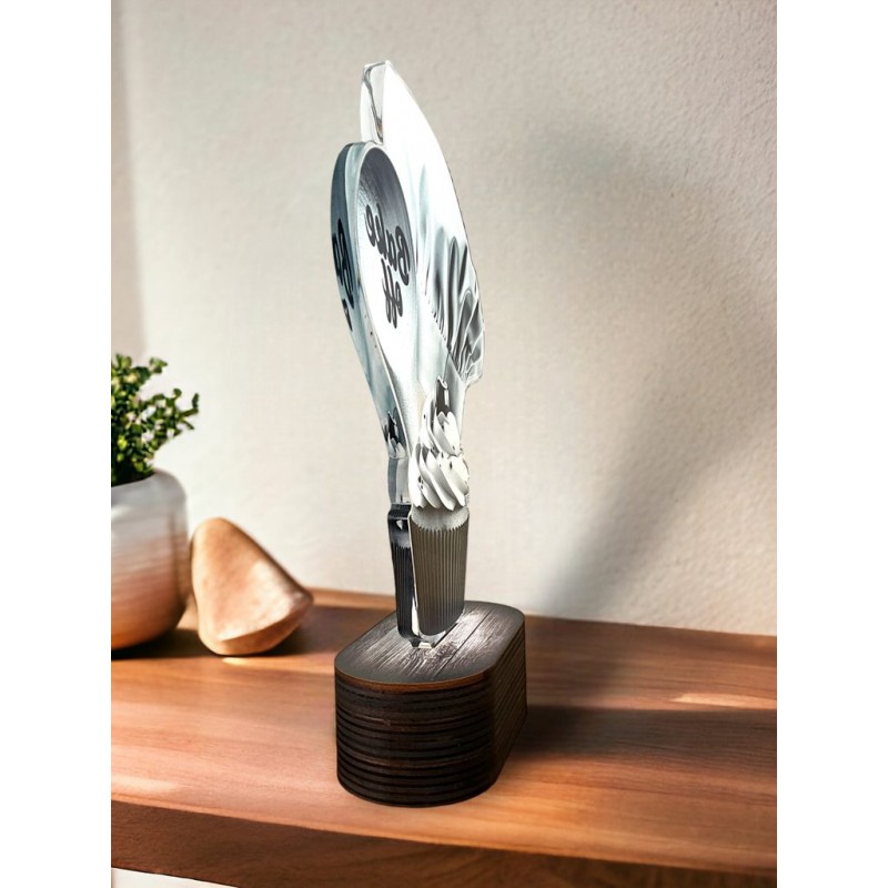 Akrylátová trofej s dřevěným podstavcem a UV potiskem. Výšky trofejí jsou orientační. V ceně trofeje není zahrnuta cena štítku.