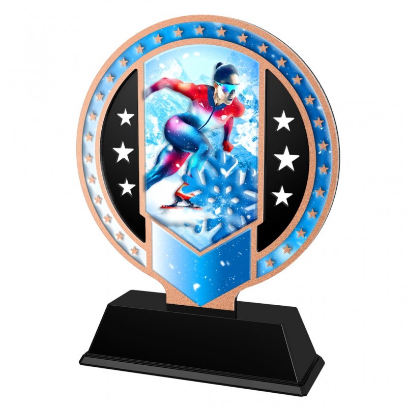 Elegantní kovová trofej kombinovaná s černým akrylátem. V ceně trofeje není zahrnuta cena štítku. Tloušťka trofeje je 0,4 cm. Podstavec je černý.