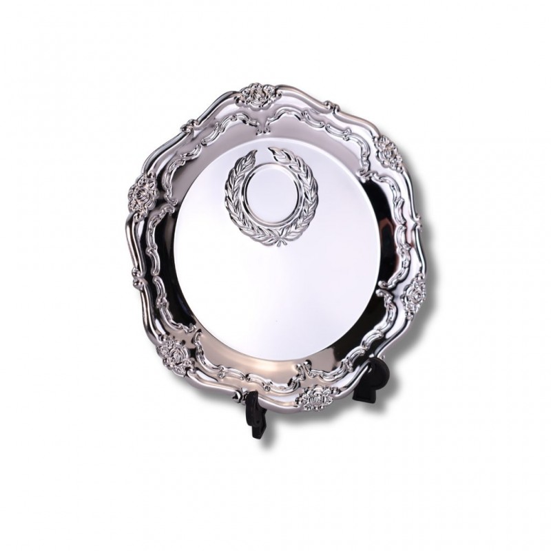 Elegantní kovový talíř na plastovém podstavci, ideální pro ocenění a slavnostní příležitosti. Možnost doplnění emblému a štítku dle vašeho přání. Cena štítků a emblémů není v ceně talíře.
