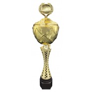 Pohár s kovovým kalichem a poklicí v ceně, plastovou nohou a dřevěným podstavcem.