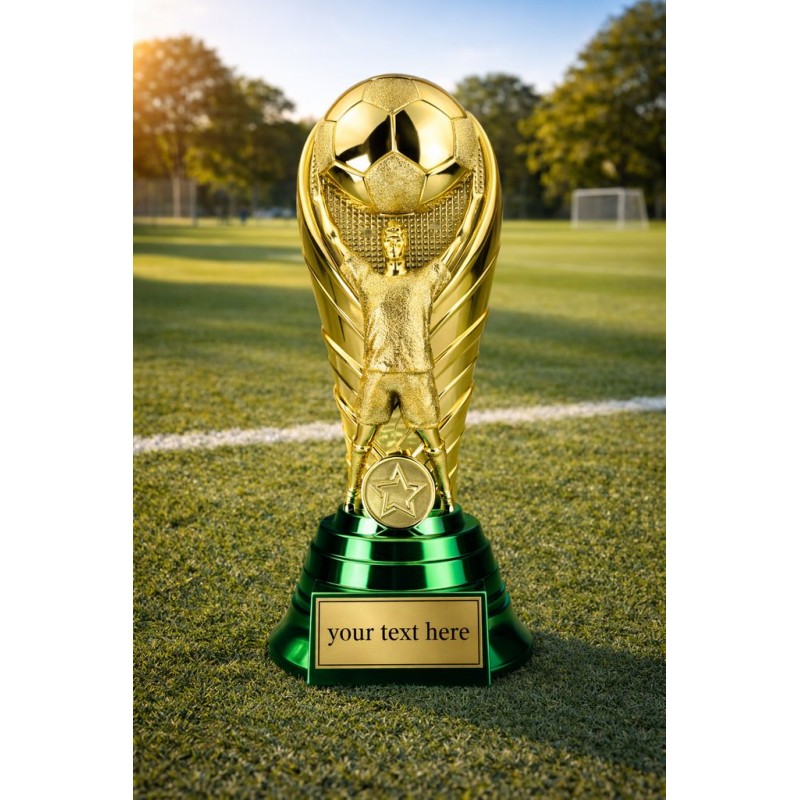 Výrazná a nepřehlédnutelná fotbalová trofej s luxusním zlatým povrchem a kvalitním zpracováním. Je vyrobena z odolného plastu a doplněna stabilním zeleným podstavcem, díky čemuž se skvěle hodí pro turnaje, ligové soutěže i týmová ocenění.